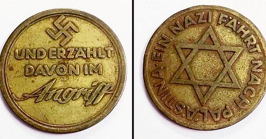 This tiny brass coin (3.5 centimeters in diameter) features a Star of David, with the words “A Nazi travels to Palestine,” on one side and a swastika on the other.